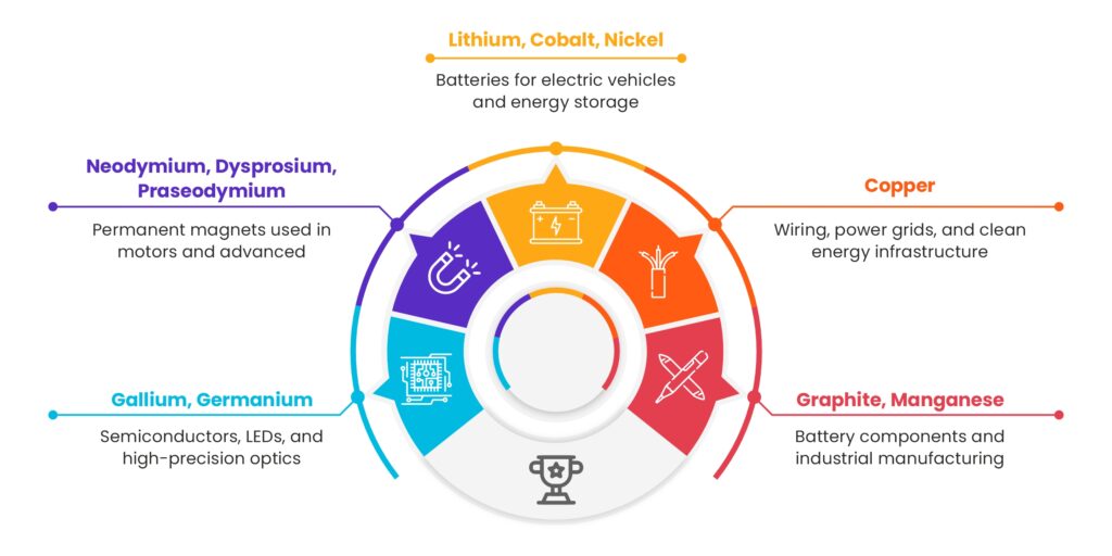 · Electric Mobility – Rare earth-based permanent magnets drive EV motors, while charging infrastructure demands vast amounts of copper. With EV adoption growing rapidly, mobility is becoming a mineral-intensive sector.